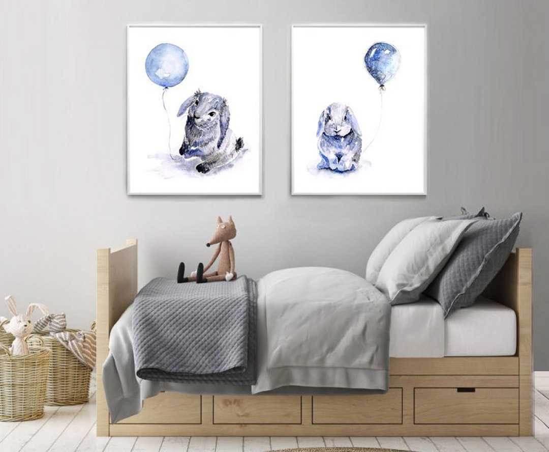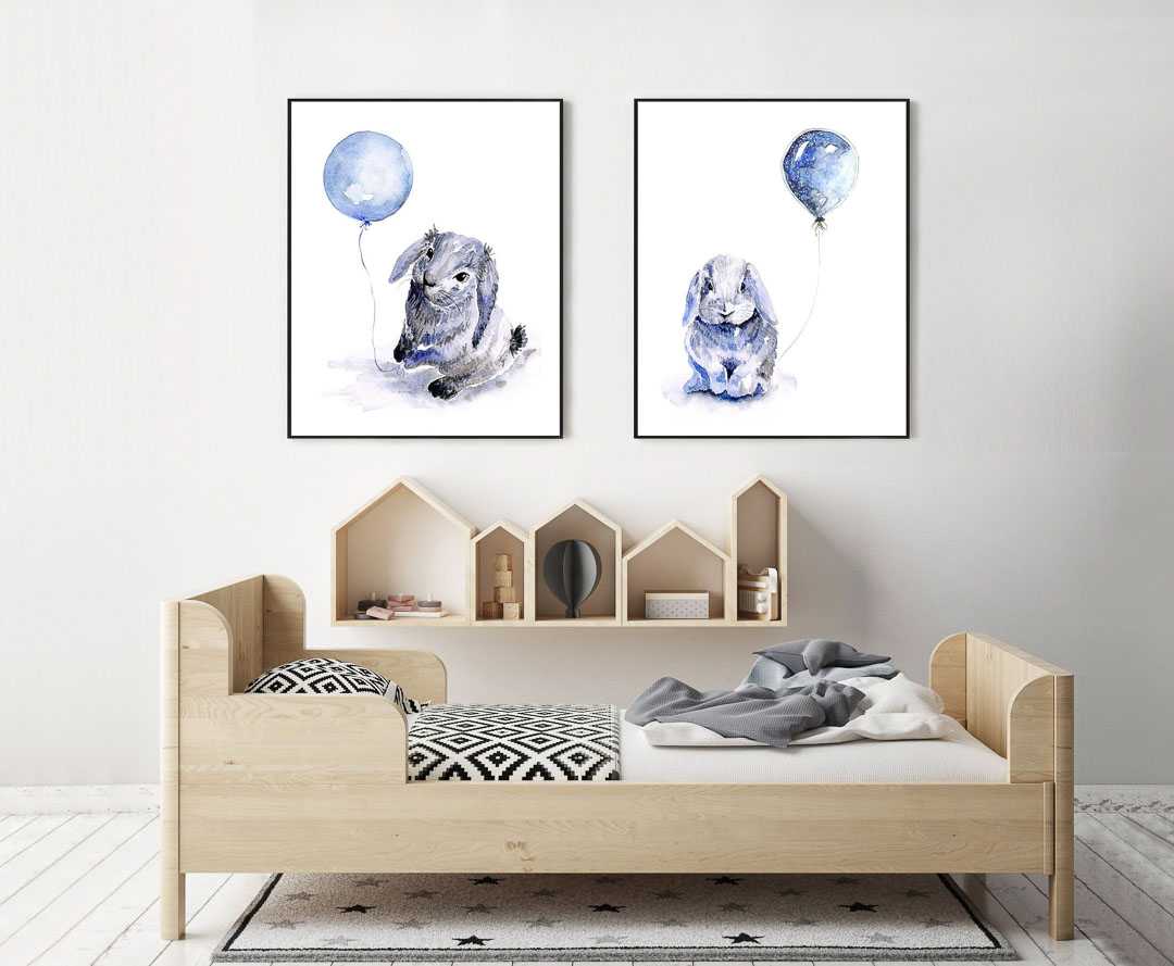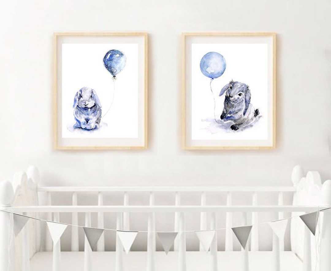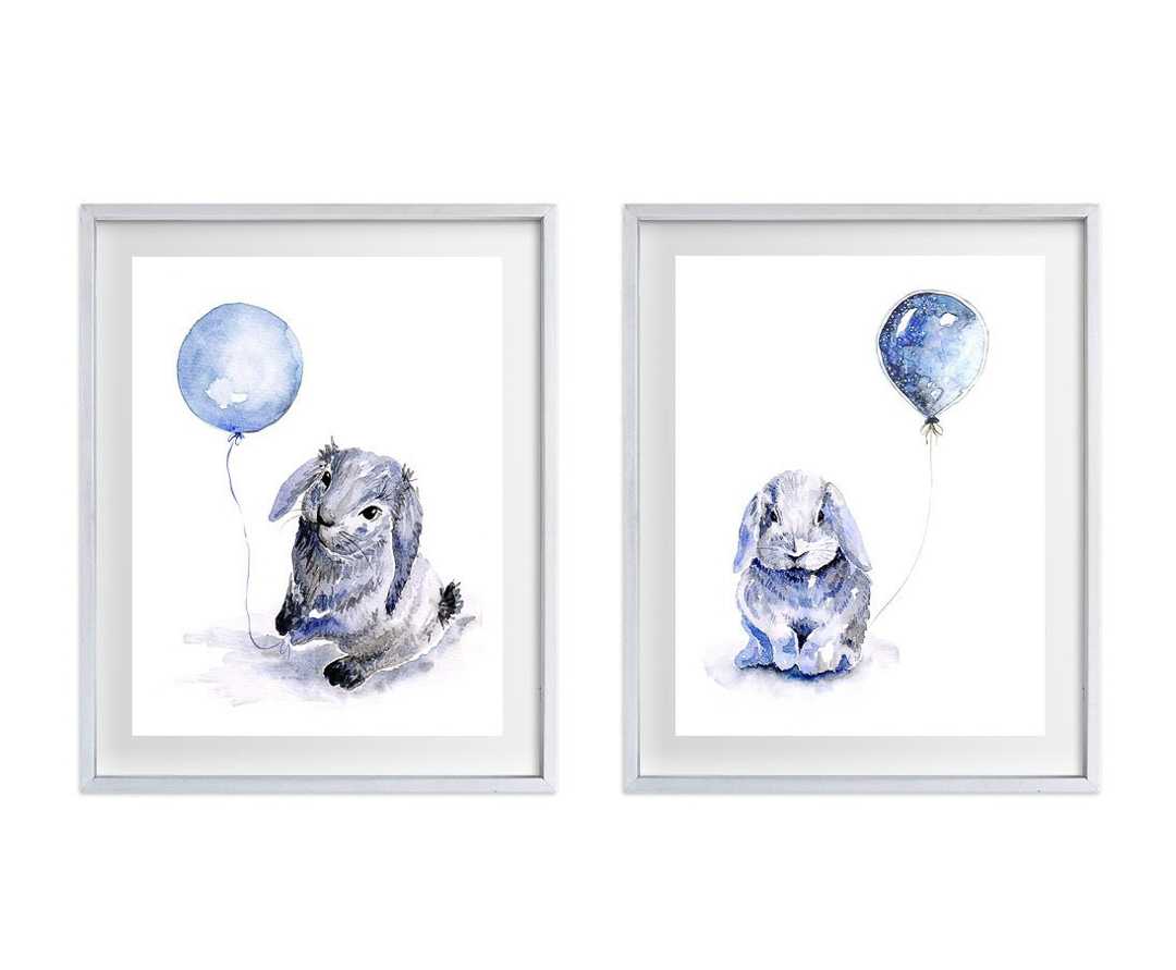 Ink & Ivy I Blue Bunnies with Balloons Watercolour Prints, set of 2