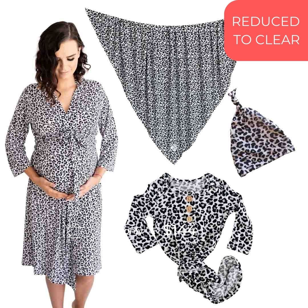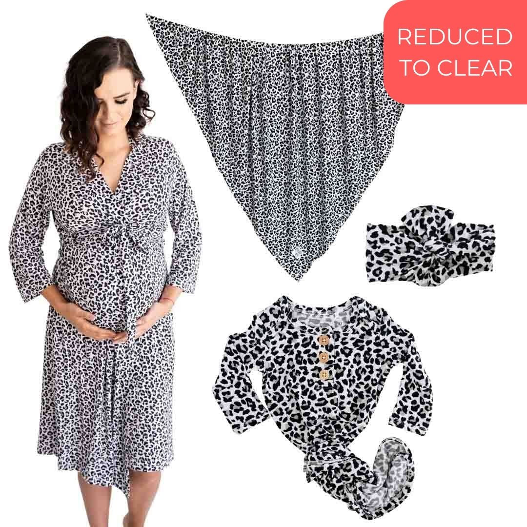 This beautiful & cosy hospital bag bundle from our Rory Leopard collection includes: