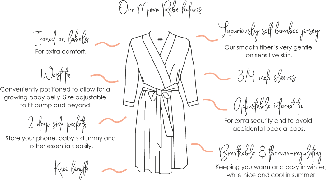 We have designed our robe to fall just below the knee to give you mamas that little bit more coverage and comfort, especially during your hospital stay. Our 3/4 inch sleeves make everyday wear a breeze as they won't get in the way when bathing bub, changing nappies, washing bottles or doing the dishes. Two handy and deep side pockets let you carry your and bubs essentials like dummy clips, phone and hair ties and our beautiful long belt is cleverly positioned to sit on top of your growing baby belly and allows for easy size adjustment pre-and post-pregnancy.