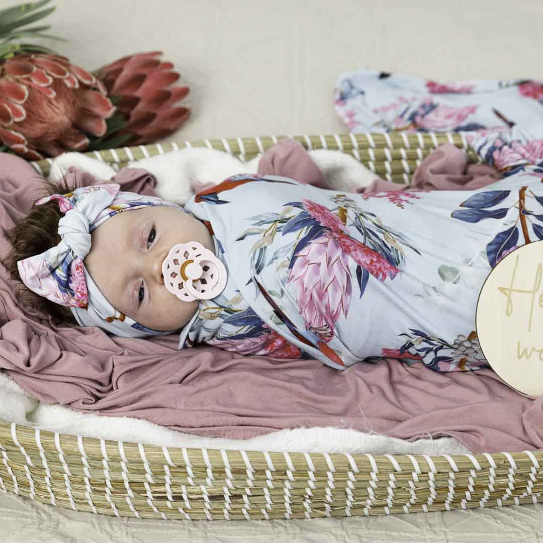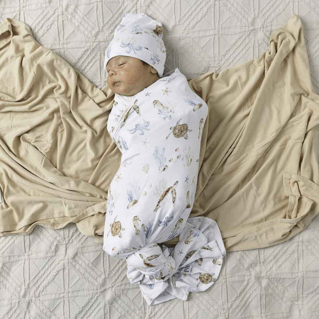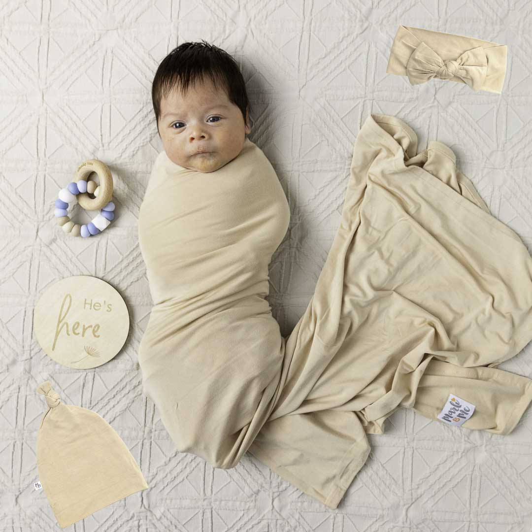 Generously sized our swaddle wraps double as a stroller canopy, nursing cover, burp cloth, blanket and more. To complete the look, and to make Mama’s long-awaited new baby pictures even more adorable, we have added a matching beanie or headband to create the most adorable swaddle sets.
