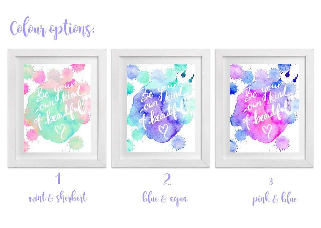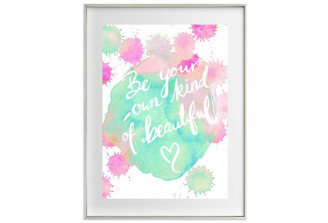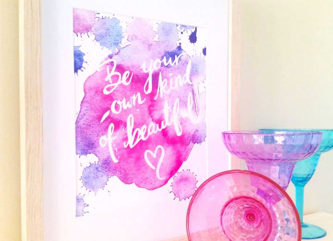 Be Your Own Kind of Beautiful! Inspirational quote with a splash of vibrant watercolour in the background.